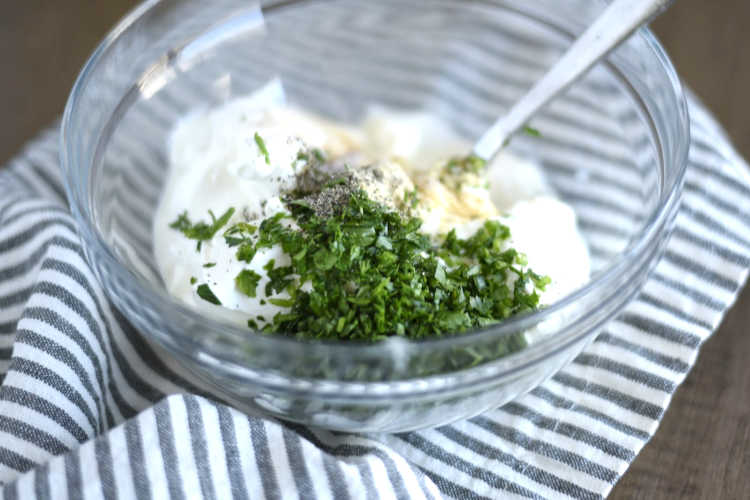 Next, add the fresh herbs to a bowl, along with mayo, sour cream, salt, pepper and garlic powder. Then, mix it until everything is well blended. And that’s all there is to making your own homemade salad dressing!