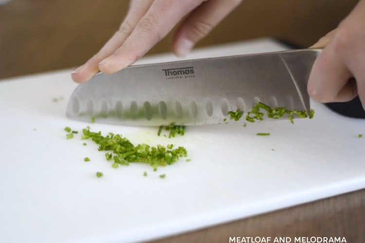 Start out by chopping up the fresh chives and parsley. Try to get the pieces as small as you can.
