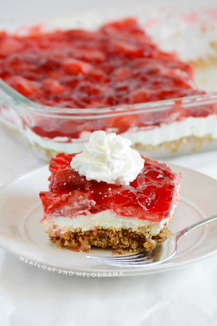 This Strawberry Pretzel Salad recipe is a layered dessert salad with a tangy strawberry Jello topping over sweetened cream cheese and a buttery pretzel crust. A family favorite perfect for holidays, showers, potluck dinners and special occasions!